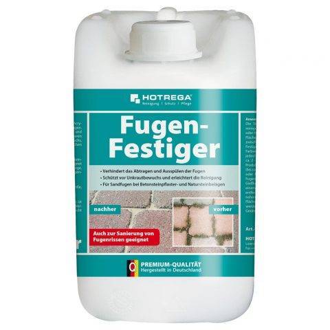 Angrenzende, nicht zu verfestigende Flächen abdecken. Die ideale Verarbeitungstemperatur liegt zwischen 8 °C und 25 °C. Die Verwendung von HOTREGA® Fugen-Festiger kann zu einer leichten Glanzbildung und optischen Farbvertiefung der Oberfläche führen. Dieser Effekt verschwindet jedoch bei freier Bewitterung der Fläche und durch Abrieb nach ca. 2-3 Monaten. Legen Sie deshalb vorher eine Probefläche an. Produkt vor Gebrauch gut schütteln bzw. aufrühren. Die Fugen (bis ca. 10 mm Breite) werden mit Quarzsand (Körnung 0,3-0,8 mm) oder Mineralstoff-Zementgemisch verfüllt. Dann den HOTREGA® Fugen-Festiger unverdünnt mit einem Drucksprühgerät oder einer Gießkanne bis zur Sättigung aufbringen. Den Überschuss mit einem Gummischieber abziehen und mit einem Besen vollständig entfernen. Rückstände in Vertiefungen mit einem Schwamm aufnehmen. Pfützenbildung am Pflaster vermeiden! Die verfestigte Fläche muss mindestens 24 Stunden vor Feuchtigkeit geschützt werden und ist nach ca. 4-7 Tagen benutzbar. Nach dem Auftrag Geräte mit viel klarem Wasser abwaschen. -